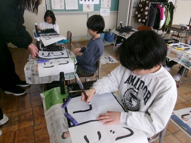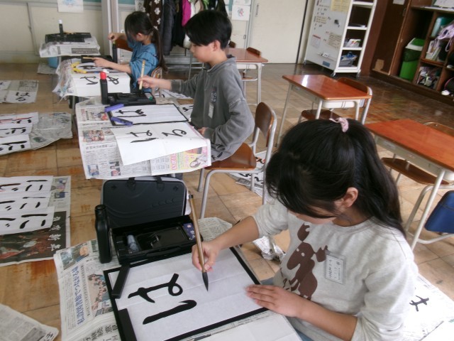3年生は書写の時間に卒業の掲示が華やかになるように「はる」「ゆめ」「にじ」の文字を書きました。