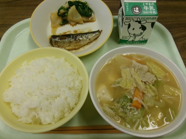 今日の献立は、ごはん、牛乳、いわしの土佐煮、甘酢あえ、ごま豆乳鍋です。