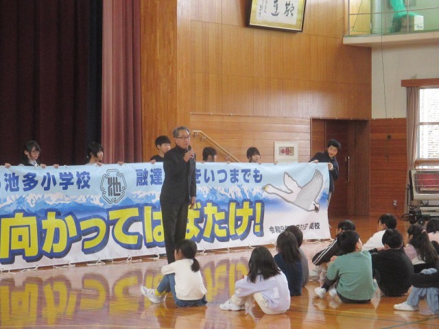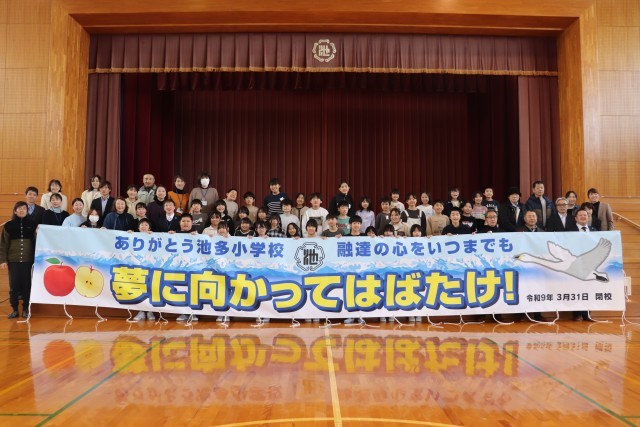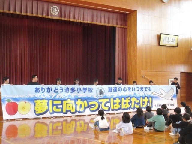 「ありがとう池多小学校 融達の心をいつまでも 夢に向かってはばたけ!」という言葉が描かれています。