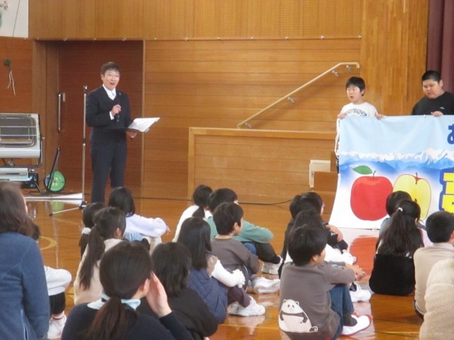全校児童、職員、保護者、地域の方が見守る中、横断幕お披露目会が行われました。