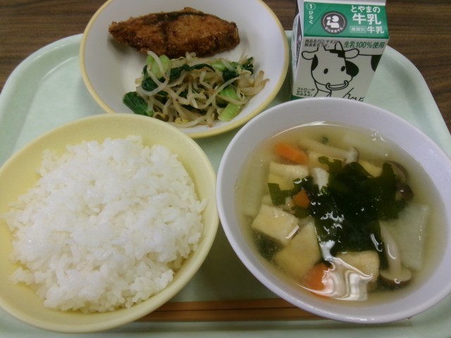 今日の献立は、ごはん、牛乳、ふくらぎのカレー揚げ、おひたし、五目汁です。