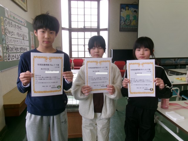 図書室の貸し出しが多かった6年生に賞状が手渡されました。