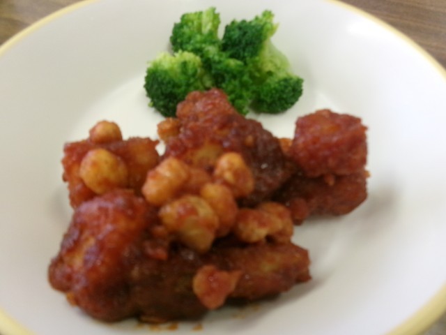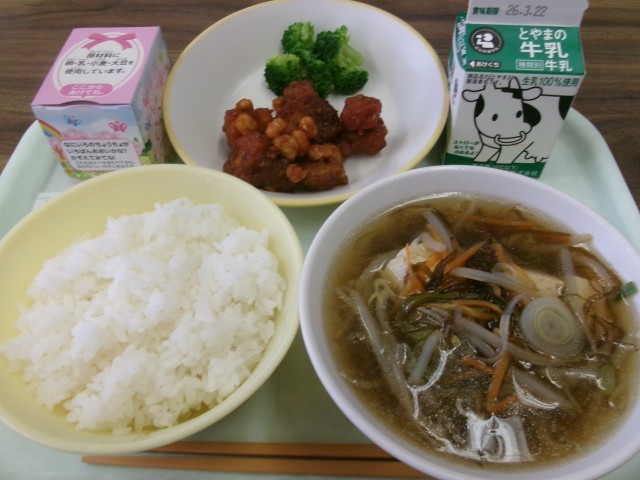 今日の献立は、ごはん、牛乳、ホキと大豆のマリアナソースからめ、ゆでブロッコリー、豆腐ともずくのスープ、そしてケーキです。