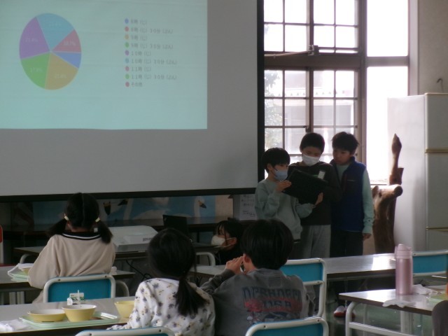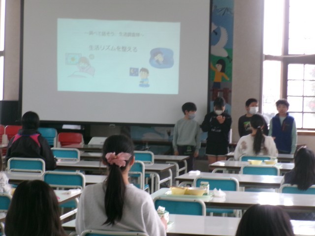 4年生が「調べて話そう 生活調査隊」の学習で、全校に起きる時刻や寝る時刻のアンケートを取り、「春休み中もしっかりと生活リズムを整えましょう!」と呼びかけてくれました。