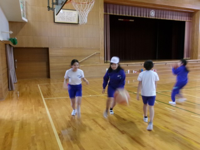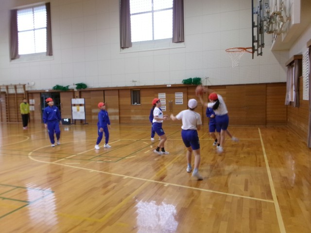 1限目に5年生がバスケットボールをしており、元気な声が聞こえてきました。