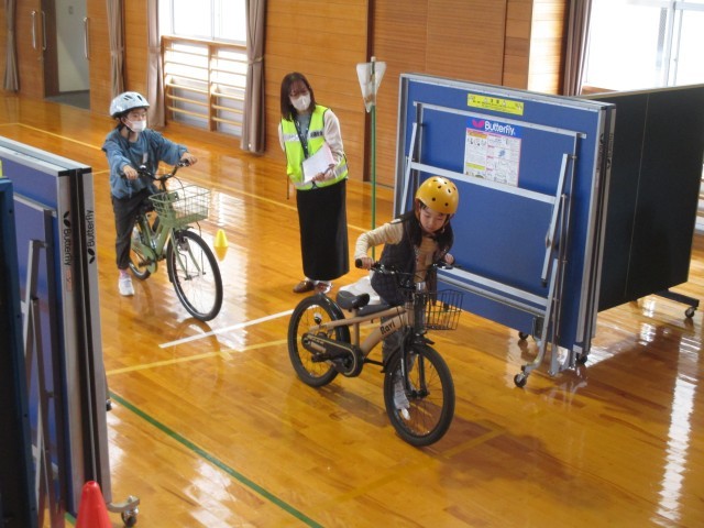 交通安全教室が開かれ、講師の方から自転車の安全な乗り方や交通ルールを詳しく教わりました。講話の後は体育館へ移動し、模擬道路を使って左右の安全確認や正しい発進・停止の仕方を一人ずつ実践しました。今日学んだ「ブタはしゃべるら(点検の合言葉)」などの交通ルールをしっかりと守り、これからも事故のない安全な生活を心がけていきましょう。