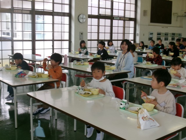 今日の献立は、ごはん、牛乳、いわしの梅煮、いり大豆和え、塩肉じゃがです。