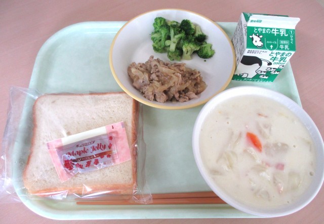 今日の献立は、食パン、牛乳、ポークソテー、クリームシチュー、ゆでブロッコリー、メープルジャムです。
