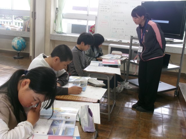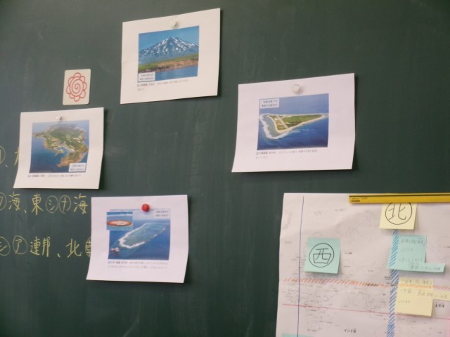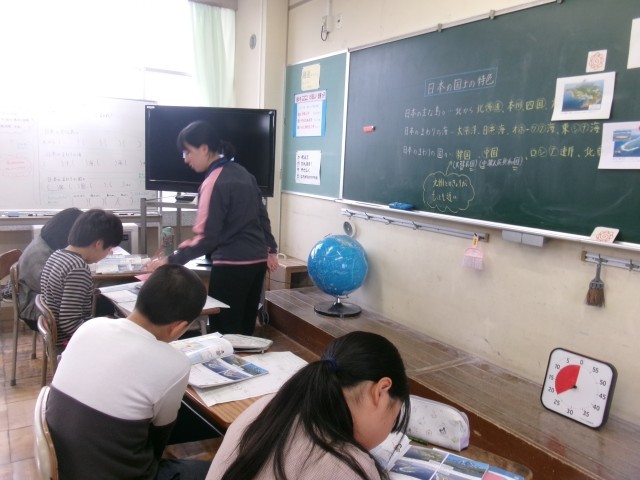 先生のクイズに何度も答えながら、日本の国土について知識を深める子供たちです。