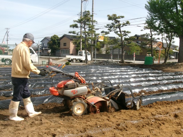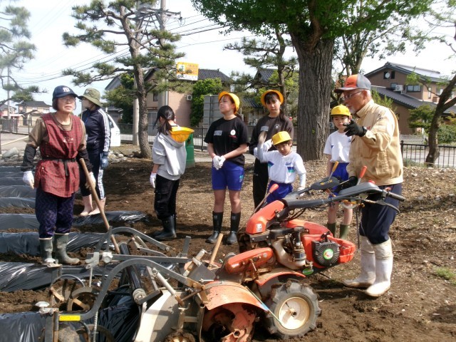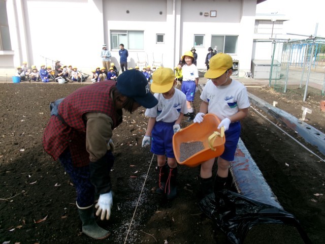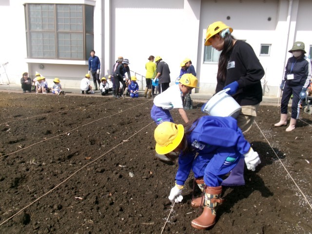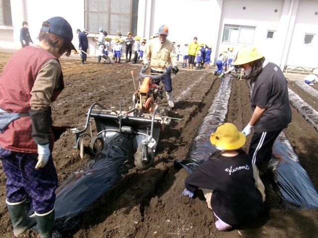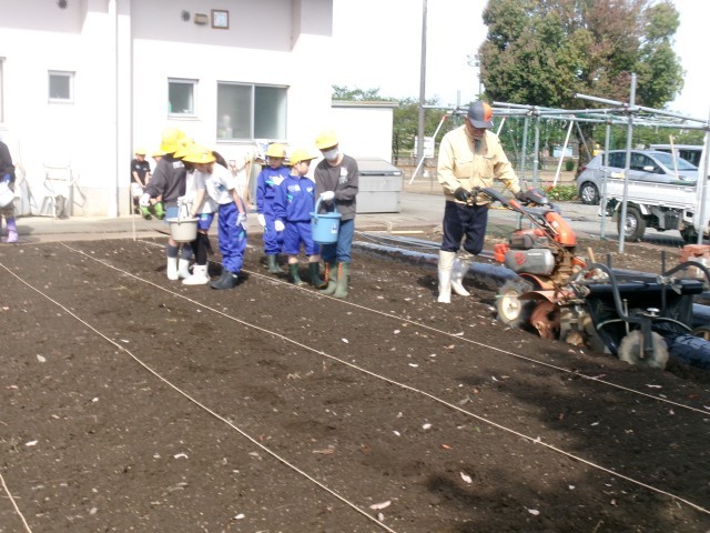 子供たちが肥料を撒き、機械で土を耕し、うねを作っていきます。