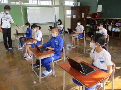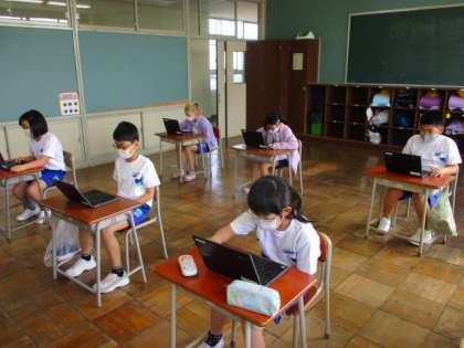 4年生教室、5・6年生教室では、さっそく今日からクロムブックを活用しています。