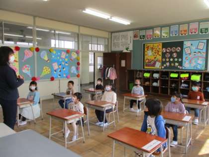 担任の先生から、学校生活のいろいろな約束についてお話を聞いています。