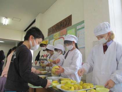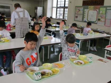 久しぶりの給食に心が弾みます。おかずやご飯を増やしてほしい手がたくさん上がりました