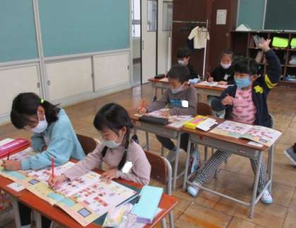 学習の入門期です。数を数えたり、先生の唱える数字の数だけ手をたたいたりして、学習を進めています。