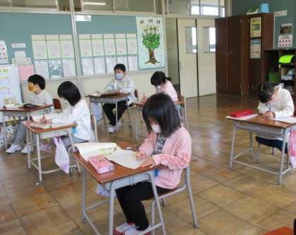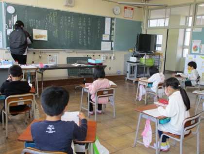 「ふきのとう」の音読について話し合っています。「こんにちは」の読み方をどのように読みたいかを意見を出し合い、実際に声に出して読んで確認してみました。