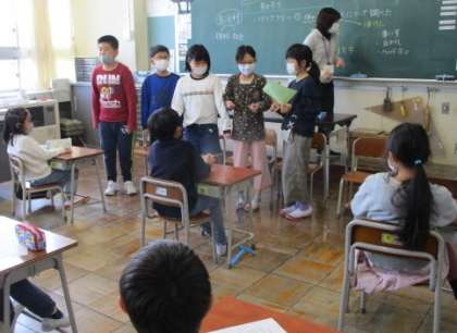 4年生が3年生に、昨年度の活動内容や自分たちが学んだことを紹介しました。