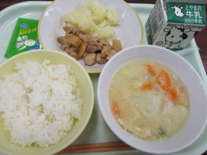 今日の献立は、ごはん、牛乳、呉汁、鶏肉の梅肉煮、こふき芋、ふりかけ です。
