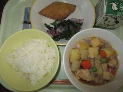 今日の献立は、ごはん、牛乳、鰆の西京焼き、ゆかり和え、大和煮、海苔佃煮です。