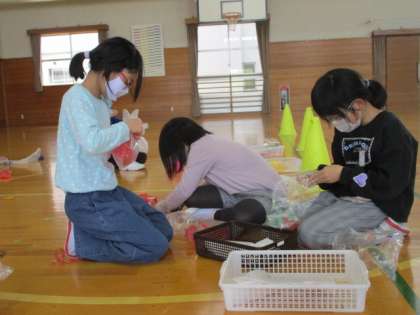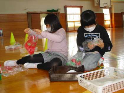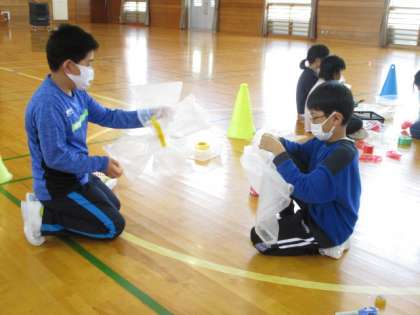 ポリエチレンの袋を利用し、風を受けて浮き上がる作品を作りました。