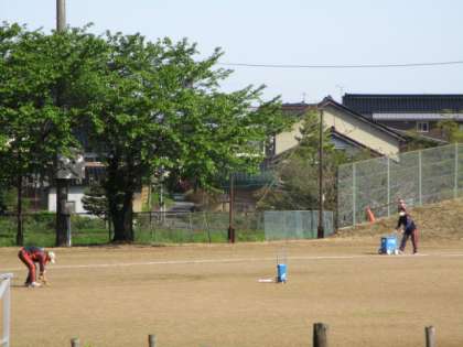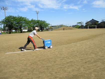 子供たちがグラウンドに出てくる前に、ライン引きです。