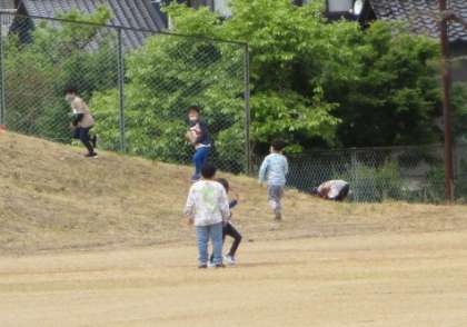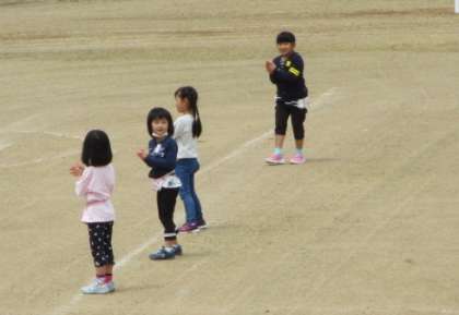 上学年の団結コールを真似て応援の練習をしている子供もいます。