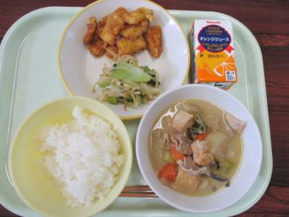 今日の献立は、ごはん、オレンジジュース、イカのかりん揚げ、もやしのおひたし、豚肉と大根のごまみそ煮、です。
