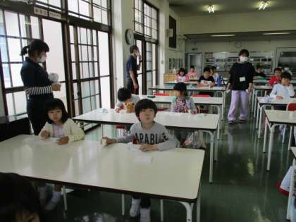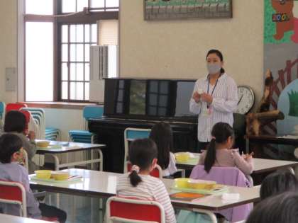 給食後、歯磨きをして、今年度初めての「フッ素洗口」を行いました。