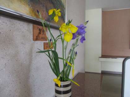 職員が自宅から持ってきて飾られたアヤメ、ショウブが初夏を感じさせます。