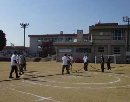 親子綱引きの企画進行はPTAの皆さんが行います。当日朝、綱を実際に伸ばして長さを確認し、ディスタンスをとって何人の大人が参加できるかをチェックしました。