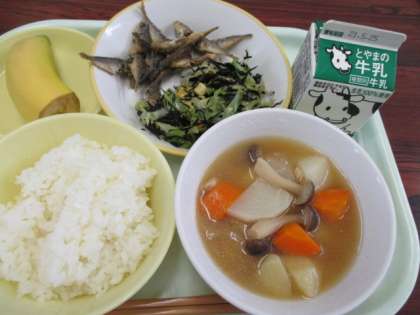 今日の献立は、ごはん、牛乳、小あじのから揚げ、ひじきのマリネ、ポトフ、バナナです。今日もおいしくいただきました。