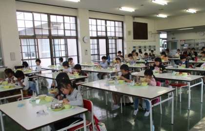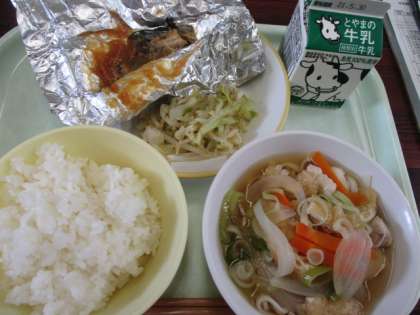 今日の献立は、ごはん、牛乳、サバの銀紙焼き、甘酢和え、かしわうどんです。
