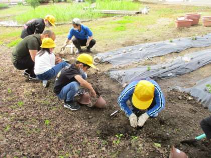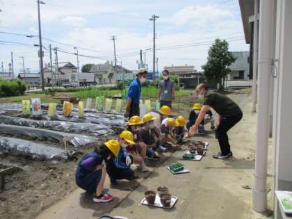 種まきして、発芽した植物を農園に植えます。