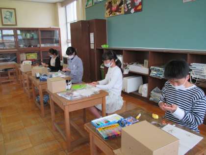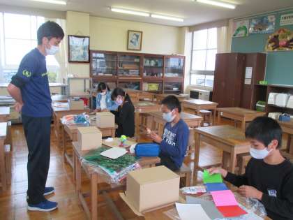 「のぞいてみれば」という単元で、子供たちは段ボール箱の中にキャンプ場、町、ホラーの世界などを工夫して作りました。箱の中を小さなのぞき穴から見ると、また違った風に見えて、子供たちは夢中で取り組んでいました。