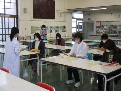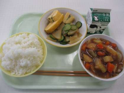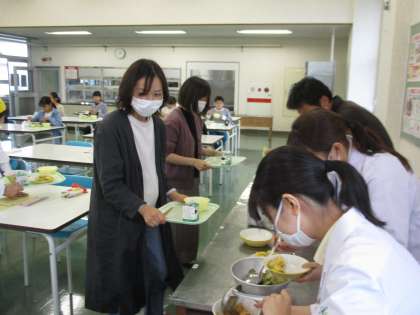栄養士の先生から学校給食についての概要を説明し、実際に子供たちとともに食べていただきました。
