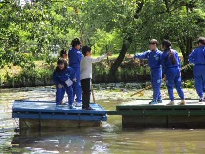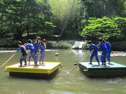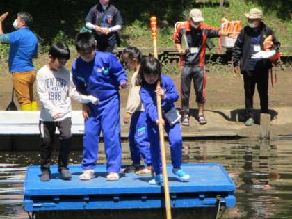 いかだ遊びの続きです。いかだの一方に人が固まって乗ると傾きます。スリルがたまりません。