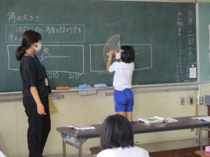 角度の測り方を理解した子供たち。180度より大きい角度の測り方について話し合っています。