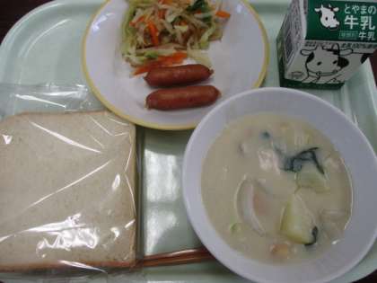 今日の献立は、食パン、牛乳、豆乳シチュー、ウインナー、おろしポン酢サラダです。