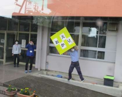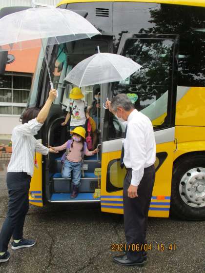 古沢小学校の友達とあいさつをして、バスに乗ります。