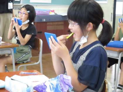 歯の正しい磨き方や歯肉炎等について学習しました。鏡を見て、歯ブラシの当て方やデンタルフロスの使い方を確認し、これからも正しい歯磨きを続けようという意識が高まりました。
