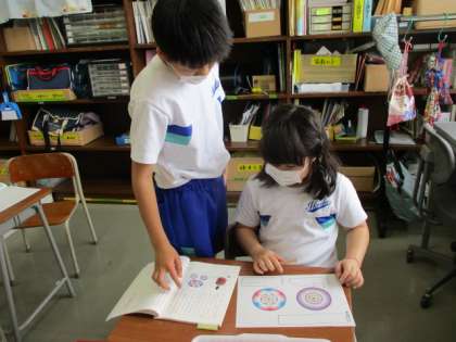 国語の説明文を読んでいます。3年生の説明文について、文章があらわしている意味を具体的に6年生が教えています。
