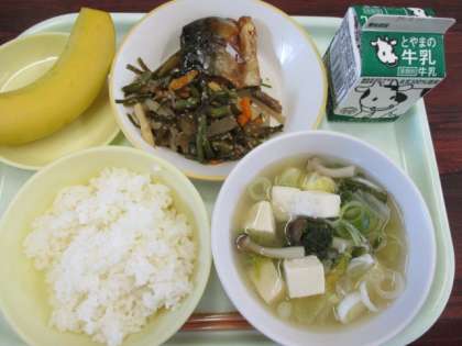 今日の献立は、ごはん、牛乳、サバの照り焼き、茎わかめのきんぴら、豆腐の味噌汁、バナナです。茎わかめのきんぴらは、海藻のうまみがぎゅっと凝縮されたおいしさです。
