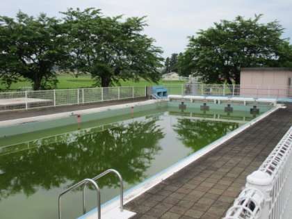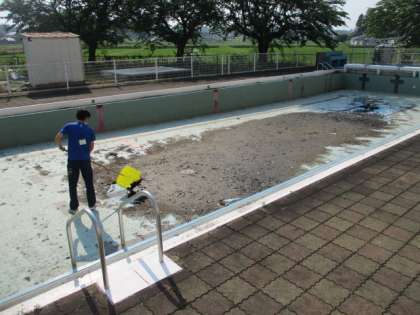 上の写真は2日前のプールです。水を徐々に抜きました。下の写真は本日のプールです。明日は2年分の泥をさらってからプール清掃を行います。