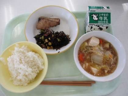 今日の献立は、ごはん、牛乳、ふくらぎの西京焼き、ひじきのソテー、豆腐の野菜あんかけです。