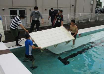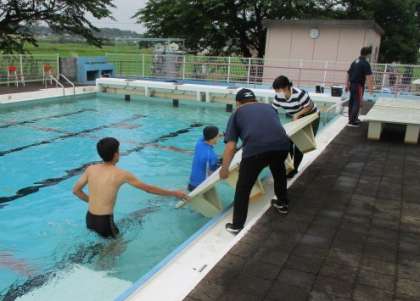 放課後、教職員でプールの水深を浅くするプールフロアを設置しました。屋外更衣室も整頓・清掃しました。