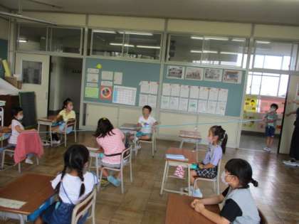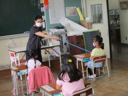 マスクをしないで咳やくしゃみをすると飛沫がとても遠いところまで飛ぶことを知って子供たちはびっくり。