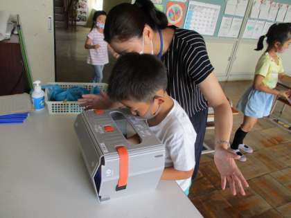 手洗いの指導も行いました。手の洗い残しのある部分が光る器具を使って、自分の手洗いについて振り返っていました。