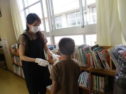 スクールサポートスタッフが消毒作業の手を止めて、図書室で子供の質問に答えてくれました。