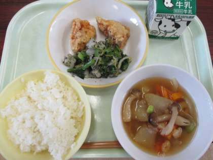 きょうの献立は、ごはん、牛乳、鶏肉のから揚げ、よごし、冬瓜の吉野煮です。