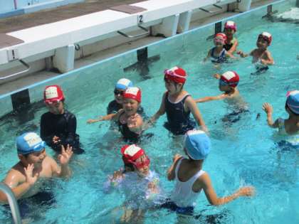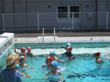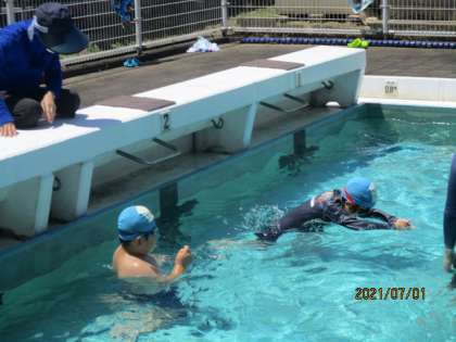 大きなプールにも慣れ、どんどんできることが増えています。プールサイドの気温が高かったので、見学者は校内で過ごしました。