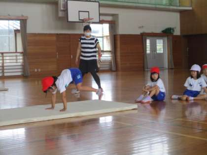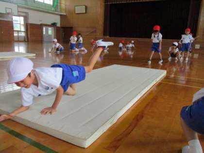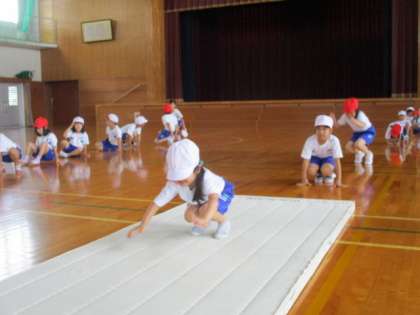 マット運動の様子です。 両手と両足を使って、跳んで進みます。